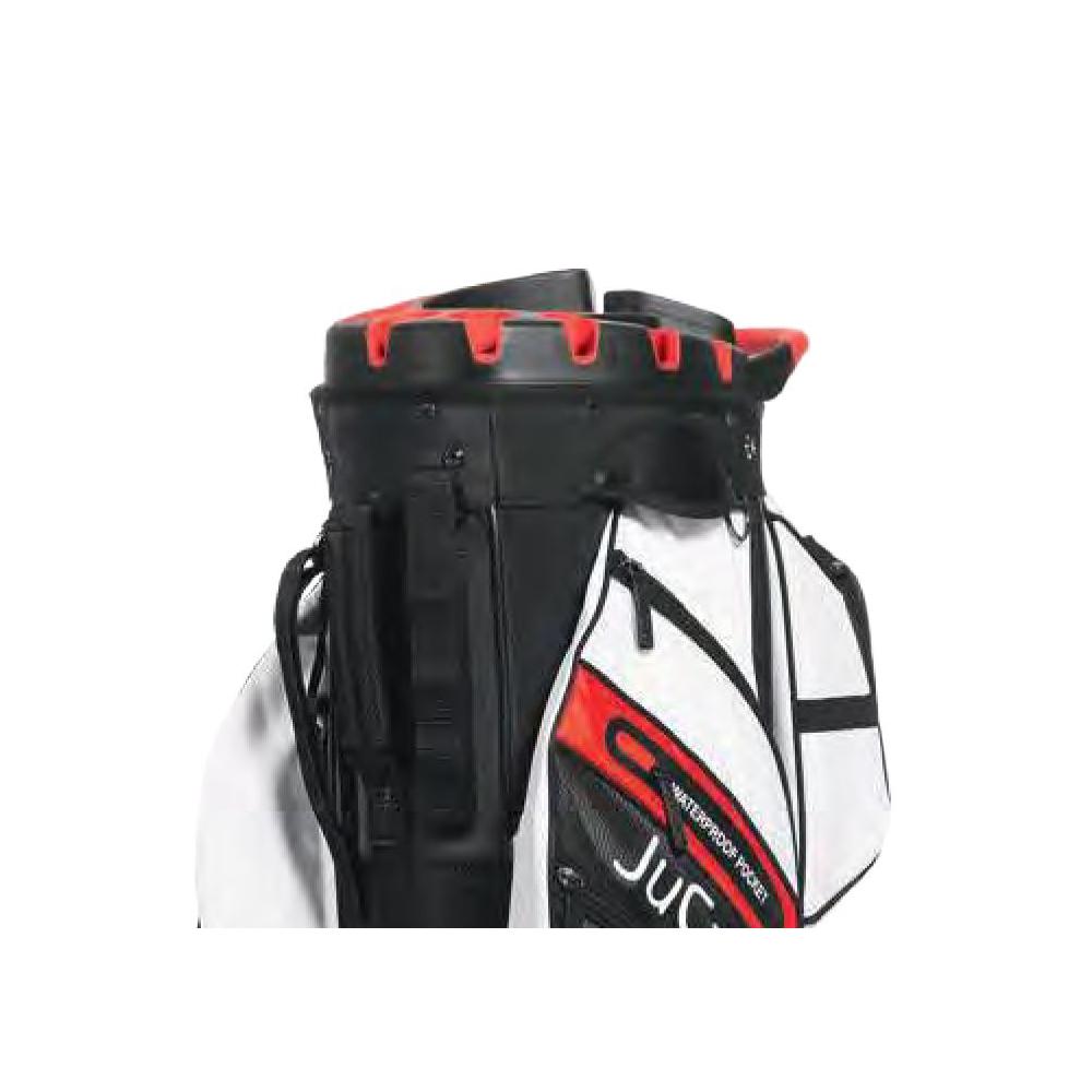 Das JuCad Bag Quiet Line mit wasserabweisender Oberfläche ist der ideale Begleiter für Golfer, die zwischen Cartfahren und Golftrolley wechseln. Dank des verstärkten Systems im oberen Gurtbereich lässt sich das Bag gut fixieren - ob auf dem Cart/Buggy oder dem Caddy. Die lösbare Fronttasche verdeckt elegant die Befestigungen, während seitliche Baggummi-Tunnel sicheren Halt für Gurte bieten. So bleibt alles perfekt fixiert. Das wasserabweisende Material, hochwertige Reißverschlüsse und zwei wasserdichte Fächer schützen Ihre Ausrüstung zuverlässig. Der schaftfreundliche Organizer hält Ihre Schläger fest in Position - ganz ohne Klappern, ganz ohne Ablenkung. JuCad Bag Quiet Line - das leise, elegante und vielseitige Golfbag für alle, die auf dem Caddy oder dem Buggy bestens organisiert unterwegs sein wollen.