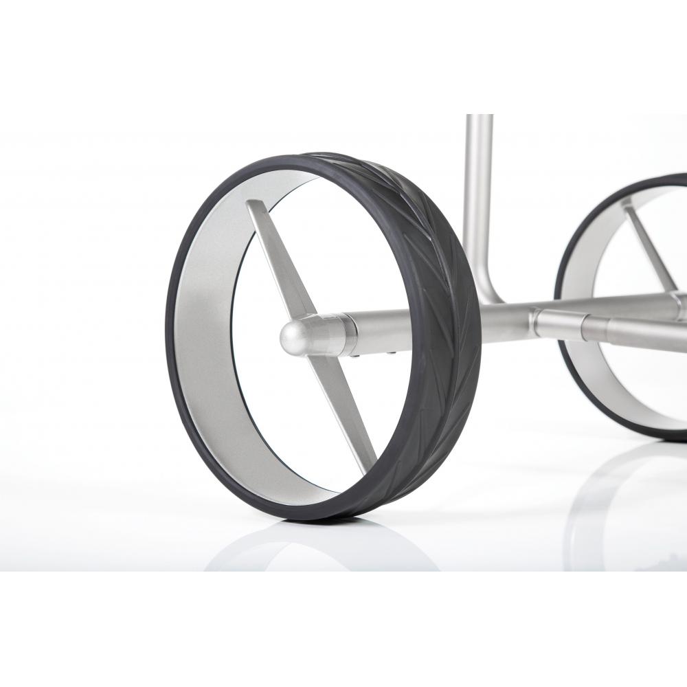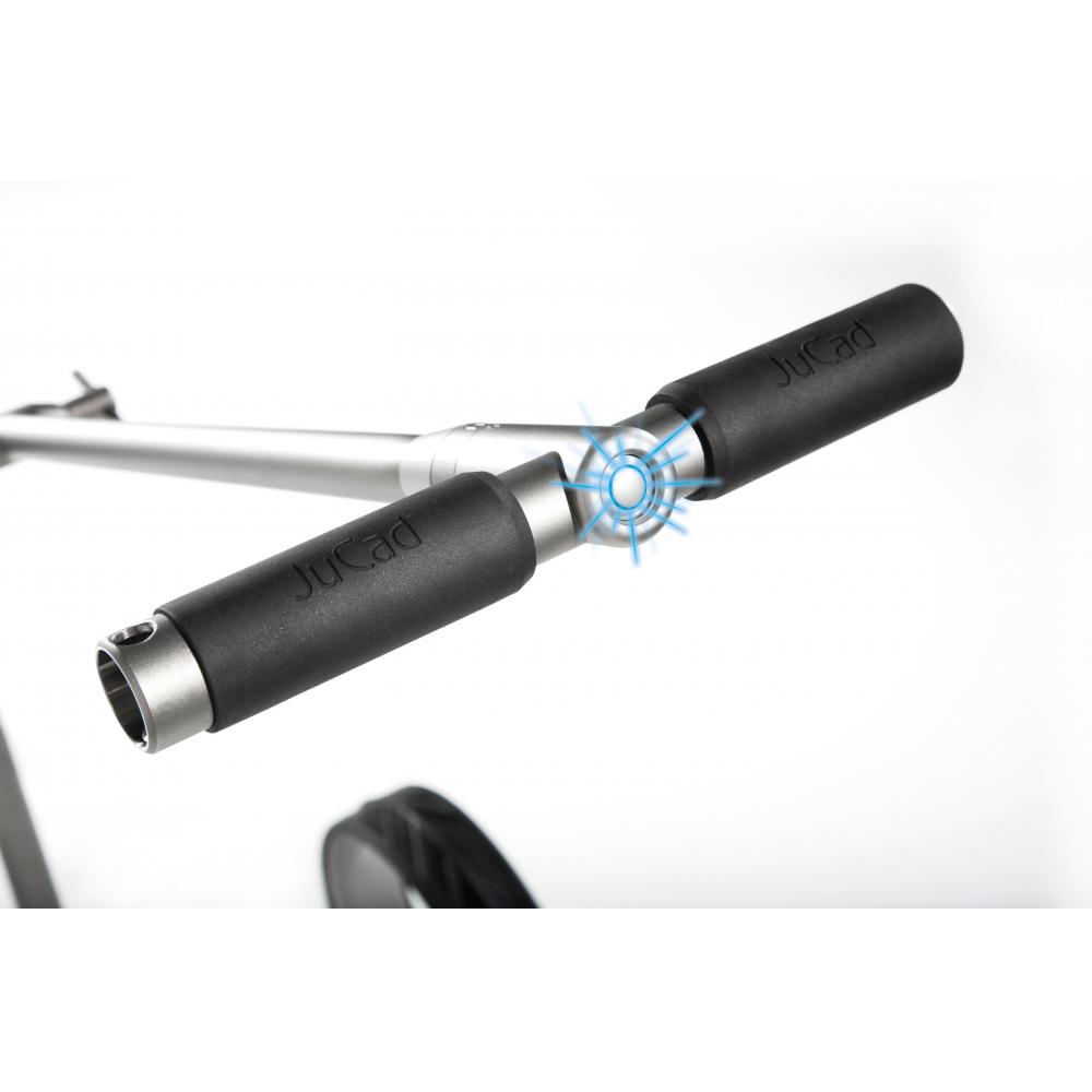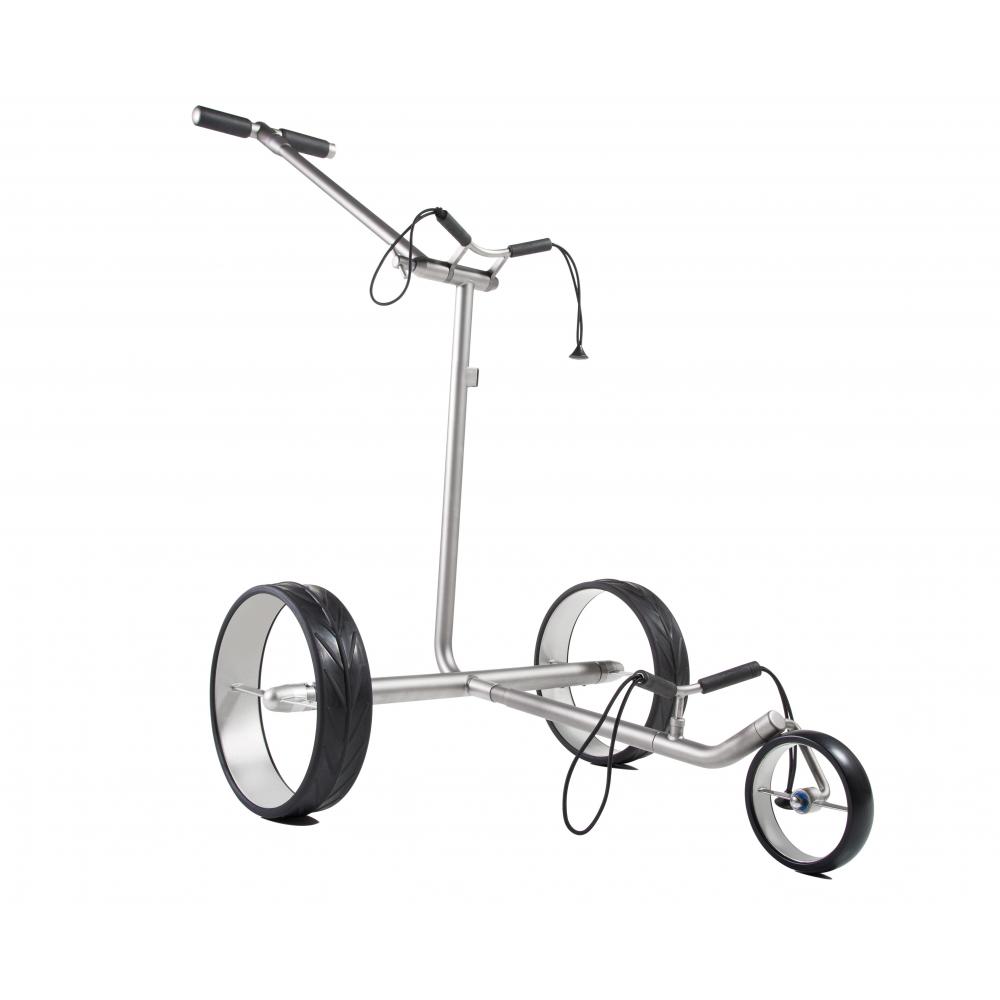 Der JuCad Ghost Titan 3.0 mit den Zweispeichenfelgen und bewährten technischen JuCad Features, bewegt sich mit der neuesten Steuerungs- und Antriebstechnik „Brushless“ superleise über die Fairways. Zusätzlich zum elektronischen Bremssystem sorgt die beidseitige elektronische Parkbremse auf extrem abfallenden Hängen für einen festen und sicheren Stand des Caddys. Das neue Technikpaket beinhaltet die neuste Motoren- und ParktechnikSlope Balance Control (SBC®) für optimalen Hangausgleich, Magnetstecker sowie eine integrierte Ladestandsanzeige. Mit dem stabilem T-Griff kann der Caddy beidhändig geführt werden und bietet einen sicheren Halt auf unebenem Gelände. Zudem ist in dem T-Griff eine neigungsverstellbare Schirmhalterung integriert. Besonders praktisch ist der Magnetstecker, der sowohl am Ladegerät als auch am Powerpack und Caddy für eine sekundenschnelle und sichere Verbindung sorgt.