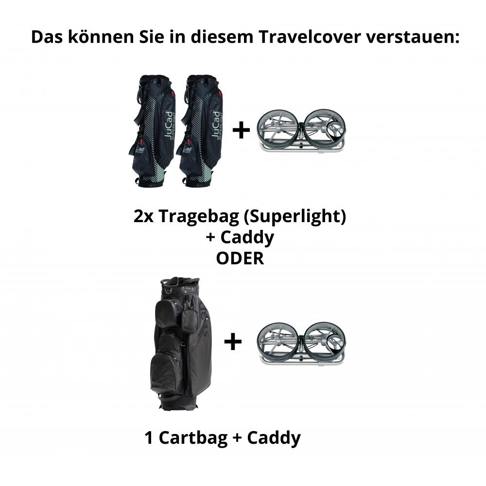 Zur Unterbringung von 1 Cartbag (z.B. JuCad Style) und 1 JuCad Trolley oder 2 Tragebags (z.B. JuCad Superlight) und 1 JuCad Trolley oder 2 Tragebags (z.B. JuCad 2 in 1 Waterproof oder Fly). Trolleyfach passend für alle manuellen JuCad Trolleys und JuCad Elektrotrolleys mit Mini-Packmaß 65x35x15cm.
