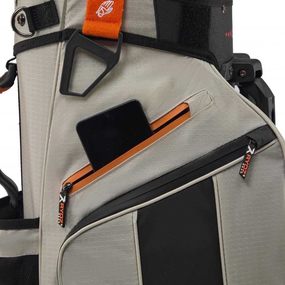 Das Rydz Gear Water Resistant 2 in 1 Hybrid Standbag Jetpack mit wasserabweisender Oberfläche und übersichtlicher Organisation im 14-Way-Mesh-Divider Top mit durchgehenden Unterteilungen zum Schutz der Schlägerschäfte und TPR-Einlage für besondere Schaftschonung.