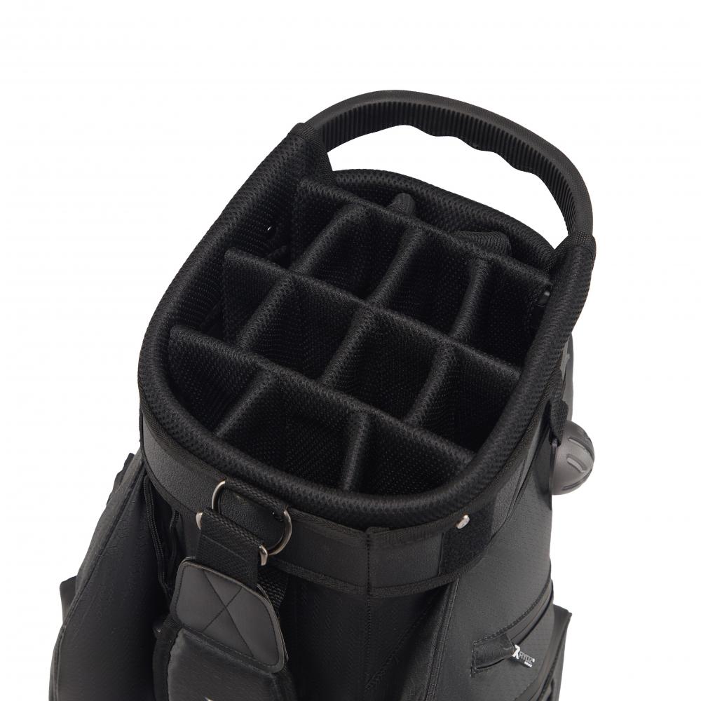 Das Rydz Gear Water Resistant Cartbag Firebee mit wasserabweisender Oberfläche und übersichtlicher Organisation im 14-Way-Mesh-Divider Top mit durchgehenden Unterteilungen zum Schutz der Schlägerschäfte.