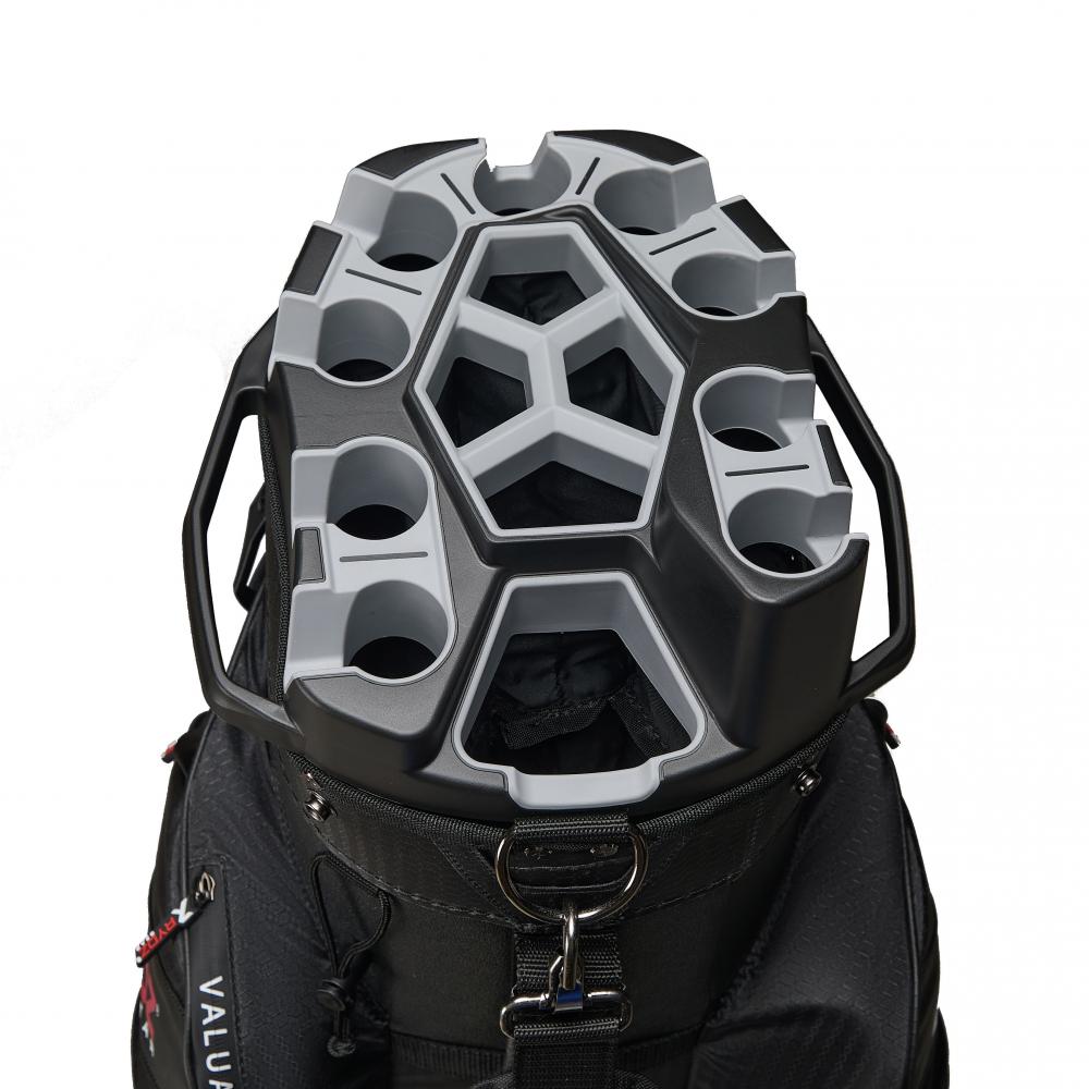 Das Rydz Gear Water Resistant Cartbag Big Rick mit wasserabweisender Oberfläche mit innovativem 14-Way Silence Organizer Top mit TPR-Einlage für besondere Schaftschonung - 9 Fächer für Eisen, 4 für Hölzer und Hybriden sowie ein großes Putterfach.