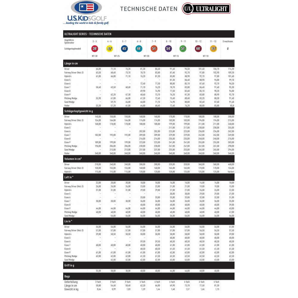 Technische Daten für U.S. Kids Golf UL7 Starterset Ultralight UL48, 7-teilig, 122-130cm, RH, navy/rot